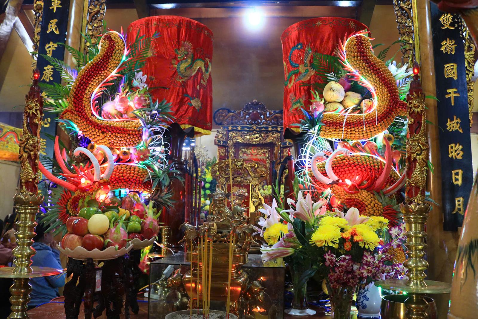 Đôi rồng làm từ trái cây tươi kết hợp hoa dâng cúng bên trong Đình thần ông Nguyễn.