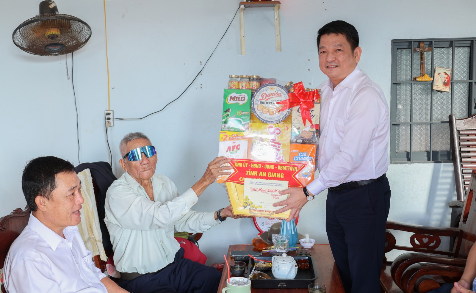 Giám đốc Sở Du lịch tỉnh An Giang Bùi Quốc Thái chúc tết, tặng quà ông Lê Hoàng Thi, người có công với cách mạng tiêu biểu, ngụ xã Kiên Lương.