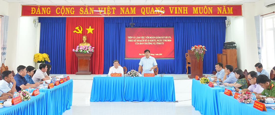 Tại buổi làm việc, Đảng ủy xã Phú Tân đã báo cáo với đoàn giám sát về kết quả tổ chức nghiên cứu, học tập, quán triệt Nghị quyết Đại hội XIV của Đảng đến cán bộ, đảng viên và nhân dân trên địa bàn. Đảng ủy xã đã xây dựng kế hoạch và tổ chức 5 hội nghị dành cho đảng viên, với số lượng tham gia đạt hơn 95% và 2 hội nghị dành cho cán bộ, công chức, đoàn viên, hội viên và người lao động chưa là đảng viên, với tỷ lệ tham gia đạt trên 94%. Đồng thời, chỉ đạo các chi bộ trực thuộc lồng ghép triển khai trong sinh hoạt định kỳ, đảm bảo 100% đảng viên được học tập, nghiên cứu nghị quyết.