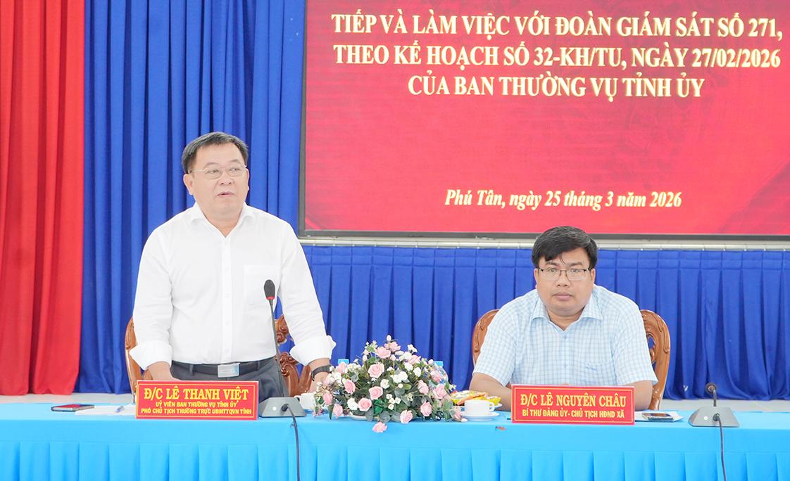 Phát biểu tại buổi làm việc, Ủy viên Ban Thường vụ Tỉnh ủy, Phó Chủ tịch Thường trực Ủy ban MTTQ Việt Nam tỉnh An Giang Lê Thanh Việt đánh giá cao những kết quả Đảng ủy xã Phú Tân đạt được trong tổ chức nghiên cứu, học tập, quán triệt và triển khai thực hiện Nghị quyết Đại hội XIV của Đảng.