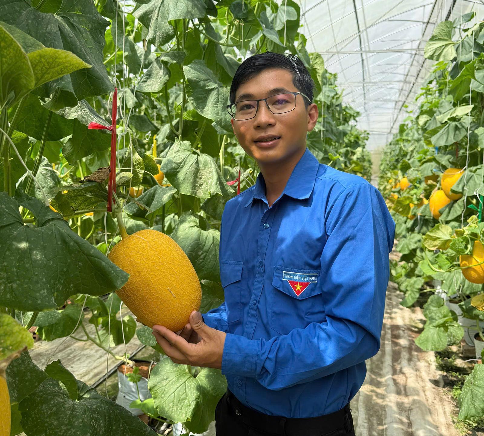Anh Bùi Hoàng Thắng - đoàn viên Chi đoàn ấp Đầu Doi, xã Hòn Đất khởi nghiệp với mô hình trồng dưa lưới, lợi nhuận gần 1 tỷ đồng/năm. Ảnh: HUỲNH ANH