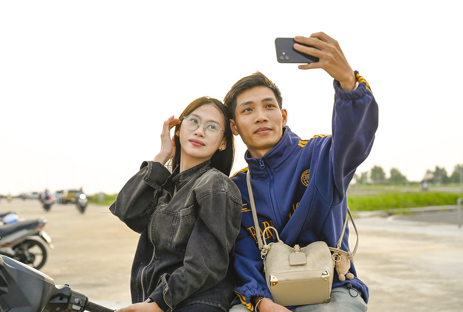 Đôi bạn trẻ tranh thủ chụp ảnh tại cảng hành khách Rạch Giá.