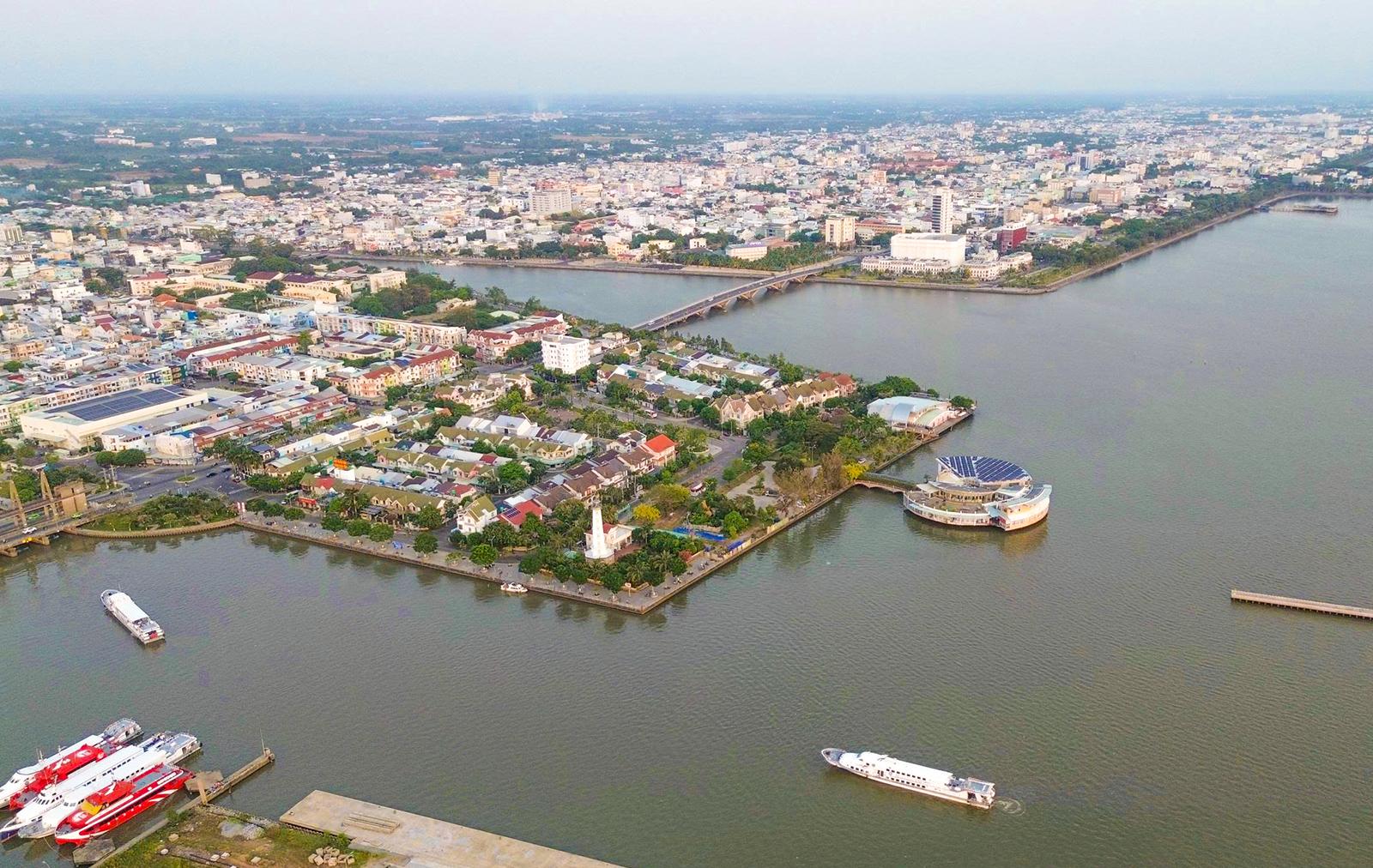 Từ cảng hành khách Rạch Giá nhìn qua đô thị biển Tây sôi động.