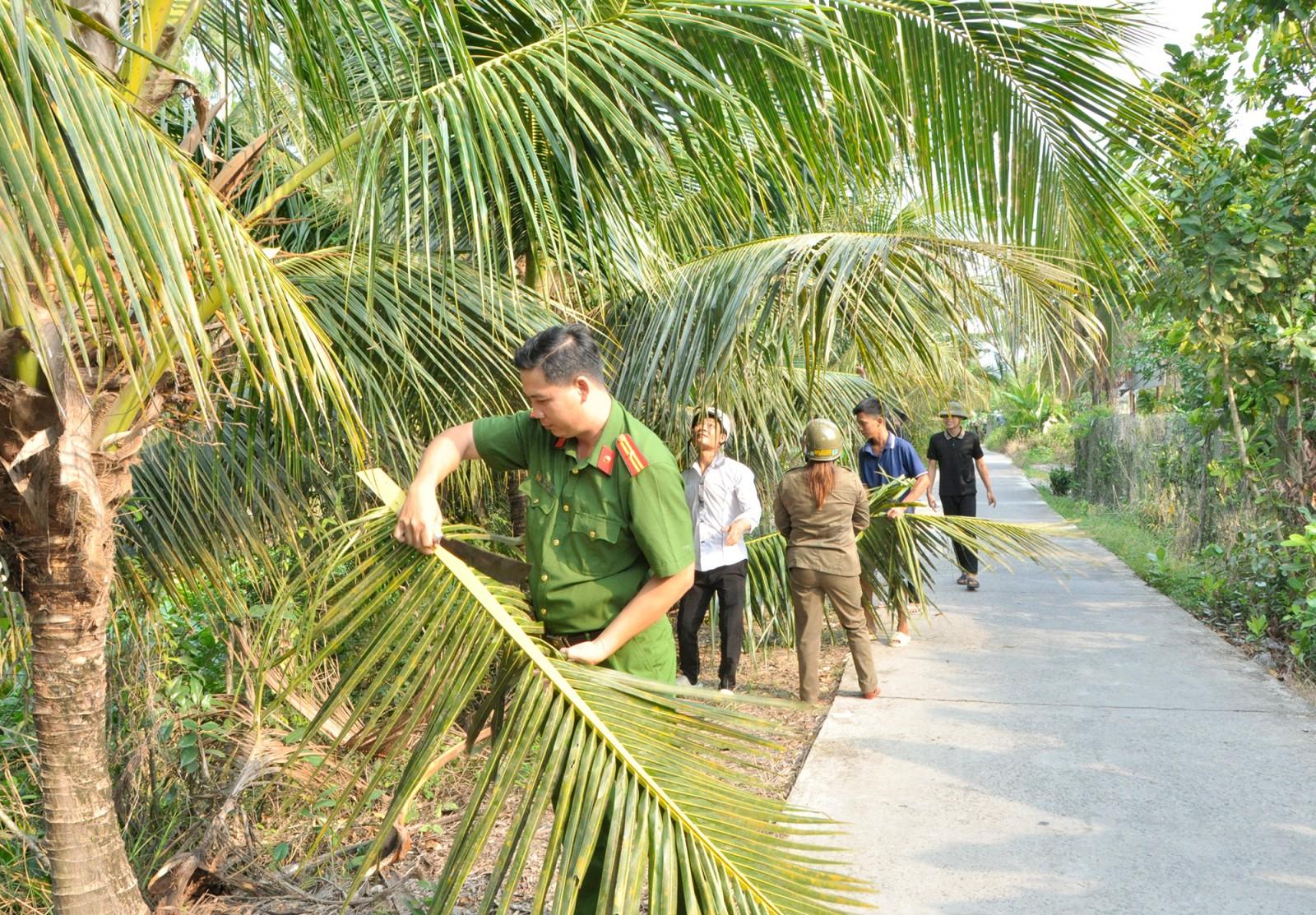 Đoàn viên, thanh niên Công an xã Giồng Riềng tham gia phát quang cây xanh ven đường. Ảnh: BÍCH THÙY