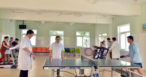 Người bệnh tập thể dục, thể thao nâng cao sức khỏe tại phòng tập phục hồi chức năng Bệnh viện Tâm thần Kiên Giang. Ảnh: MI NI