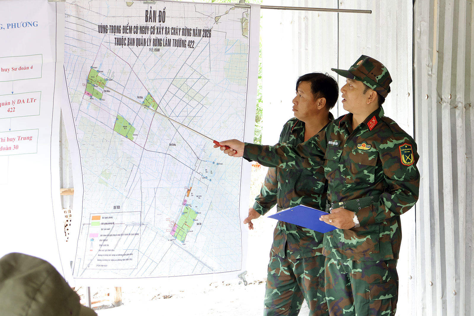 Dưới cái nắng gay gắt của tháng 3, mực nước tại các cánh rừng bốc hơi nhanh, nhiều nơi cạn dần. Nắng nóng kéo dài khiến thảm thực bì khô, dễ bén lửa; chỉ một sơ suất nhỏ cũng có thể dẫn đến cháy rừng. Vì vậy, tại các tuyến đường dẫn vào khu vực rừng do Ban Quản lý dự án Lâm trường 422 - Sư đoàn 4 quản lý, lực lượng bảo vệ rừng thường xuyên tuần tra, kiểm soát để kịp thời phát hiện và ngăn chặn nguy cơ phát sinh cháy.