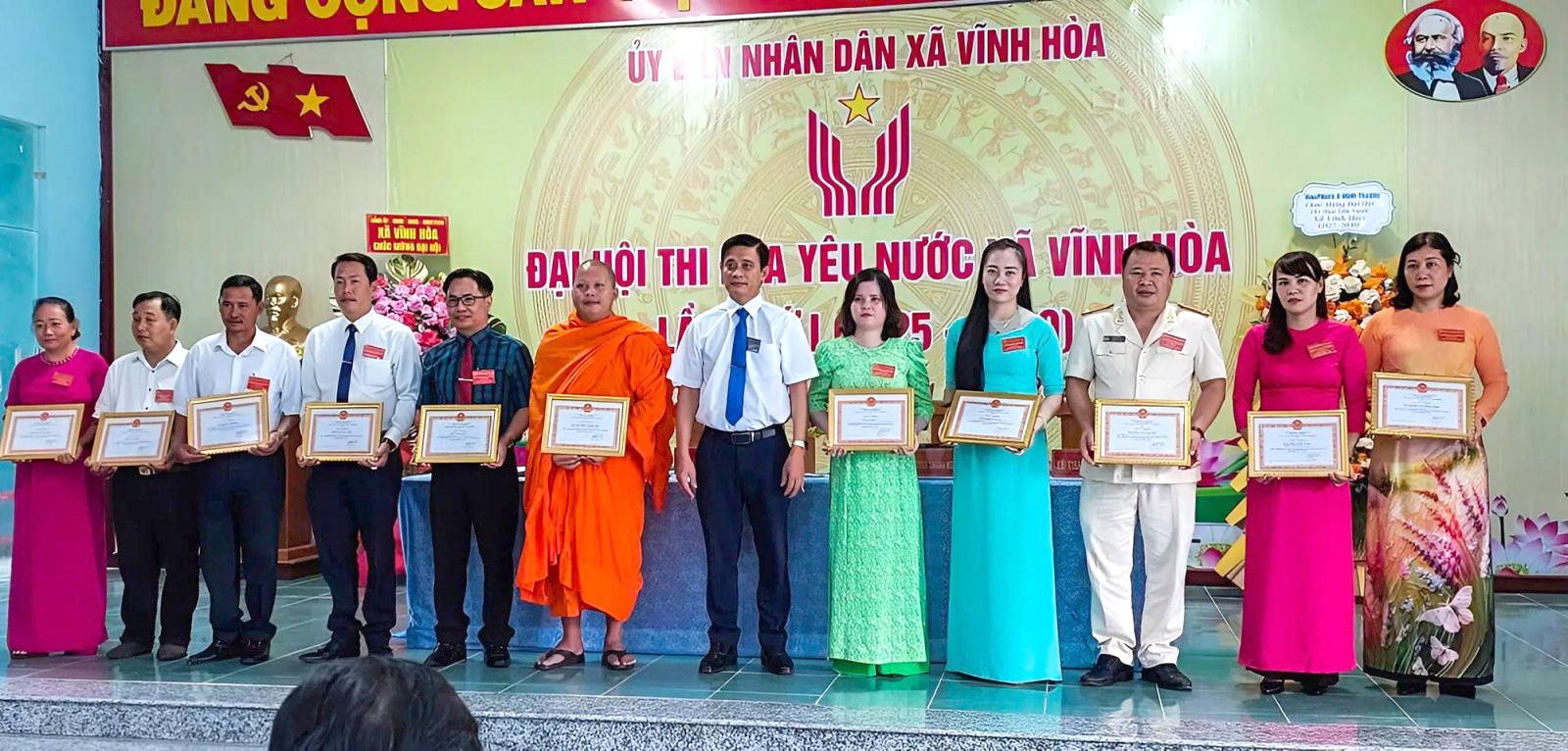 Tại đại hội, UBND xã Vĩnh Hòa tặng giấy khen 5 tập thể, 13 cá nhân có thành tích xuất sắc trong phong trào thi đua yêu nước giai đoạn 2020 - 2025; tặng giấy khen 4 cá nhân có thành tích tích cực trong công tác tuyên truyền, vận động trong cộng đồng dân cư năm 2025.