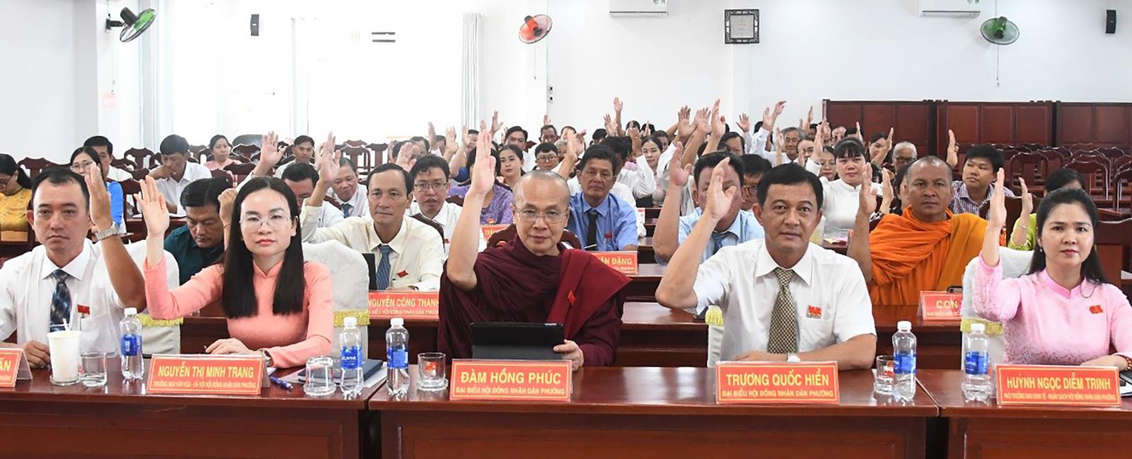 Đại biểu HĐND phường Hà Tiên biểu quyết thông qua các nghị quyết về việc đổi tên khu phố thuộc phường Hà Tiên; về chương trình giám sát của HĐND phường 6 tháng cuối năm 2025; về chương trình giám sát của HĐND phường năm 2026; về việc ban hành quy chế làm việc của HĐND phường khóa I, nhiệm kỳ 2021 - 2026.