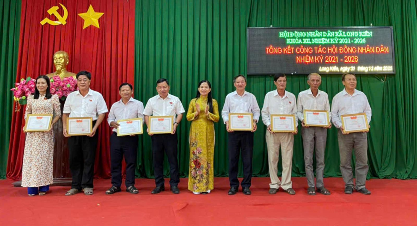 Dịp này, HĐND xã Long Kiến khen thưởng 25 cá nhân đạt thành tích xuất sắc trong thực hiện nhiệm vụ và đóng góp cho HĐND xã khoá XII, nhiệm kỳ 2021 - 2026.