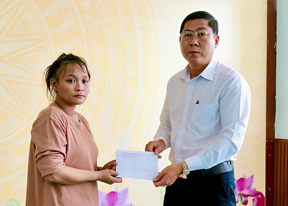 Phó Chủ tịch UBND xã An Biên Võ Thanh Toàn trao tiền hỗ trợ gia đình chị Lê Thị Kiều.