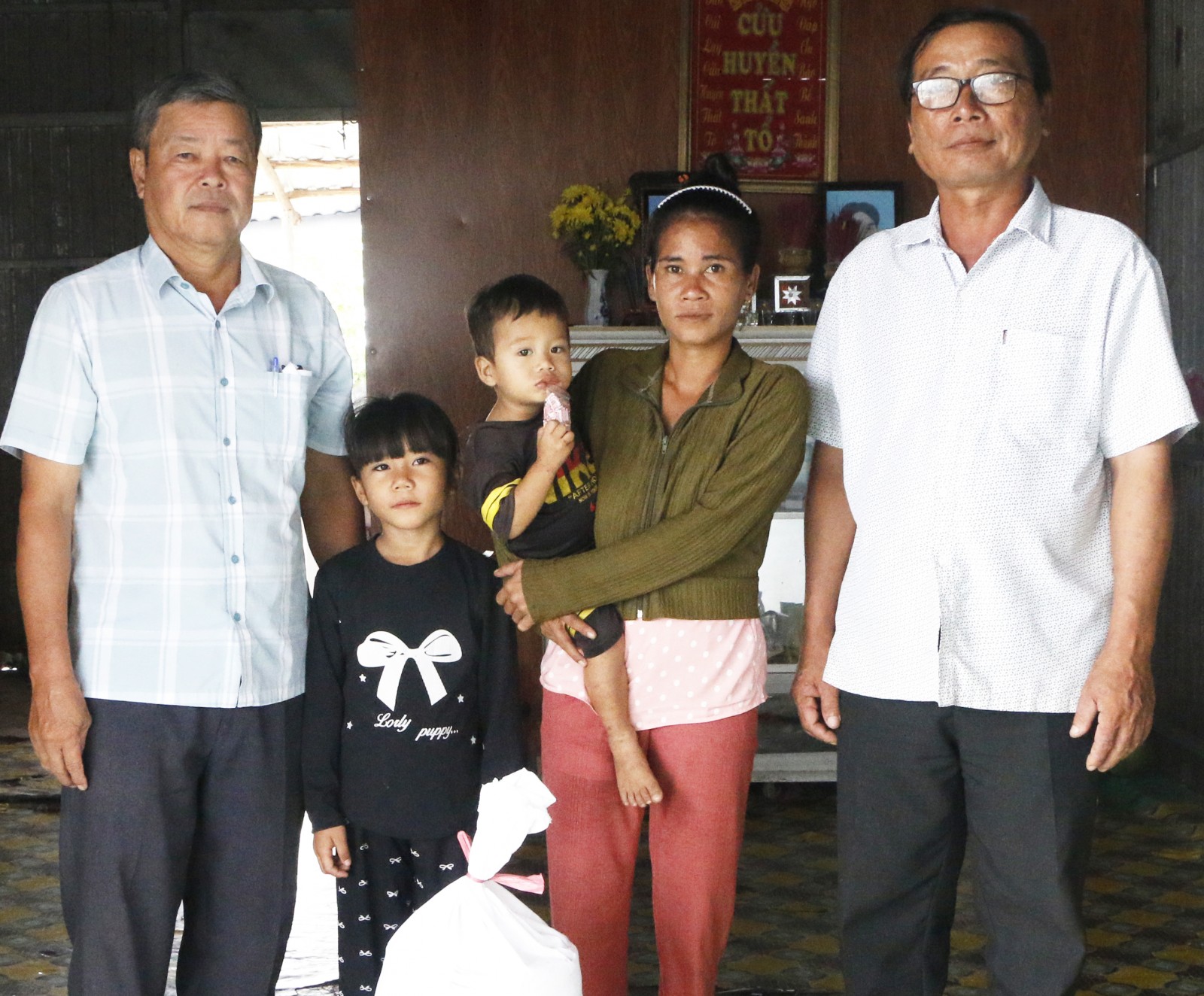 Qua những lần phát gạo hằng tháng, biết con gái chị Ry đến tuổi đi học nhưng vẫn chưa được đến trường vì hoàn cảnh gia đình khó khăn, ông Khánh động viên, giải thích cho gia đình hiểu tầm quan trọng của việc học.
