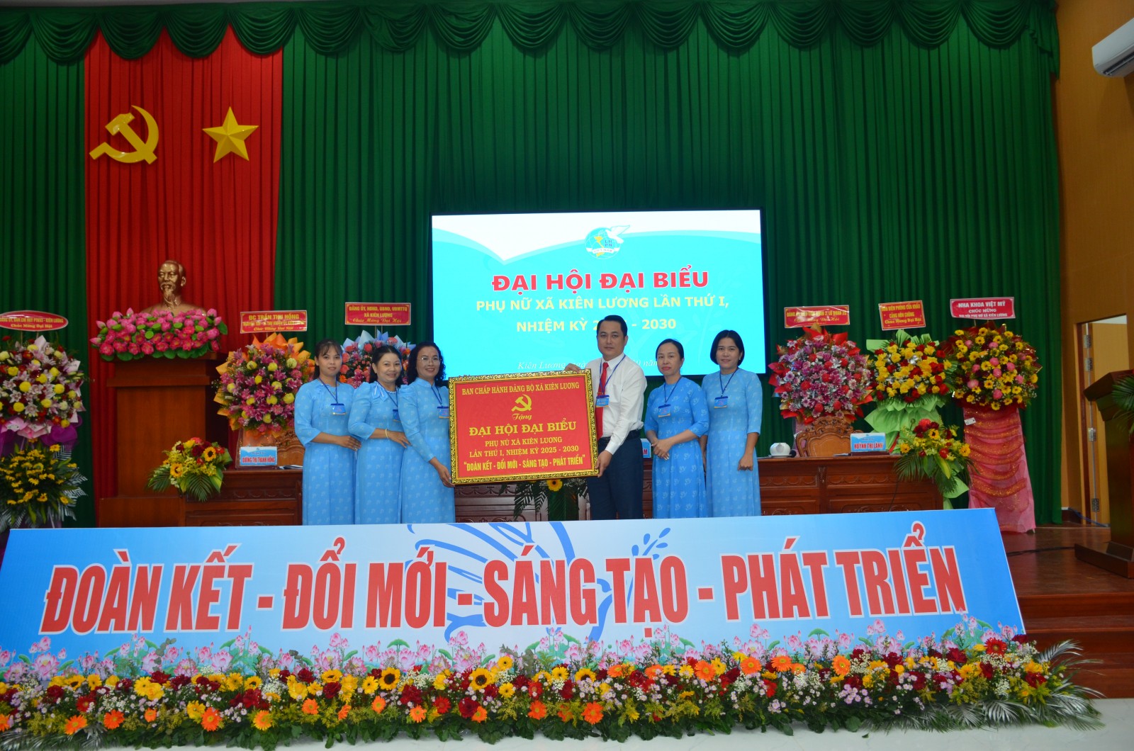 Bí thư Đảng ủy xã Kiên Lương Phan Đình Nhân trao tặng bức trướng chúc mừng đại hội.