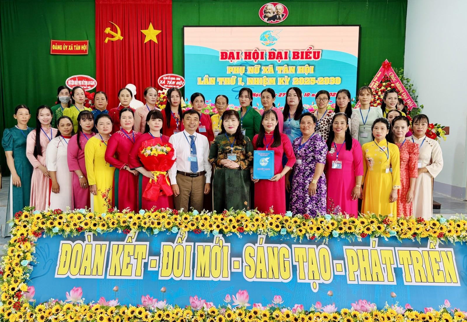 Phó Chủ tịch Hội Liên Hiệp Phụ nữ tỉnh An Giang Thái Thị Duy Ngân và Thường trực Đảng ủy xã Tân Hội chúc mừng Ban Chấp hành Hội Liên hiệp Phụ nữ xã Tân Hội, nhiệm kỳ 2025 - 2030.