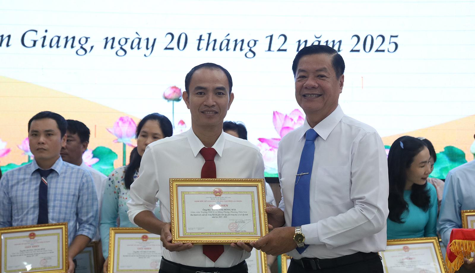 Giáo viên đạt thành tích xuất sắc trong hội thi Giáo viên dạy giỏi trung học cơ sở cấp tỉnh, năm học 2025 - 2026 nhận giấy khen của Sở Giáo dục và Đào tạo. Ảnh: BÍCH TUYỀN