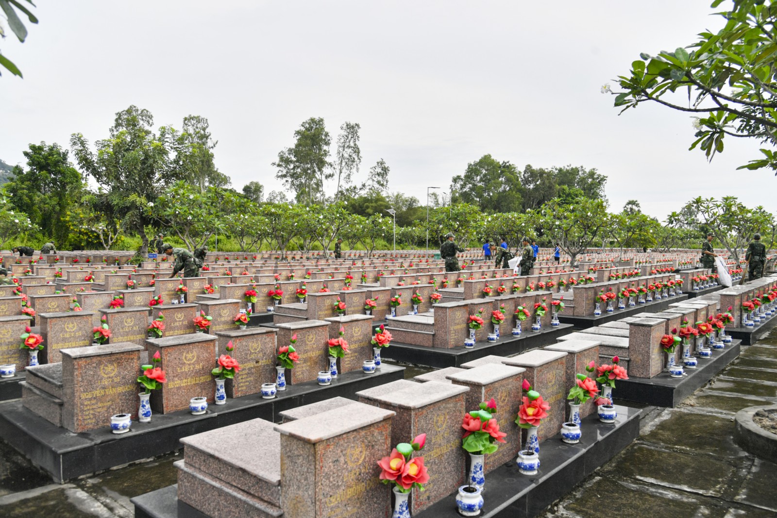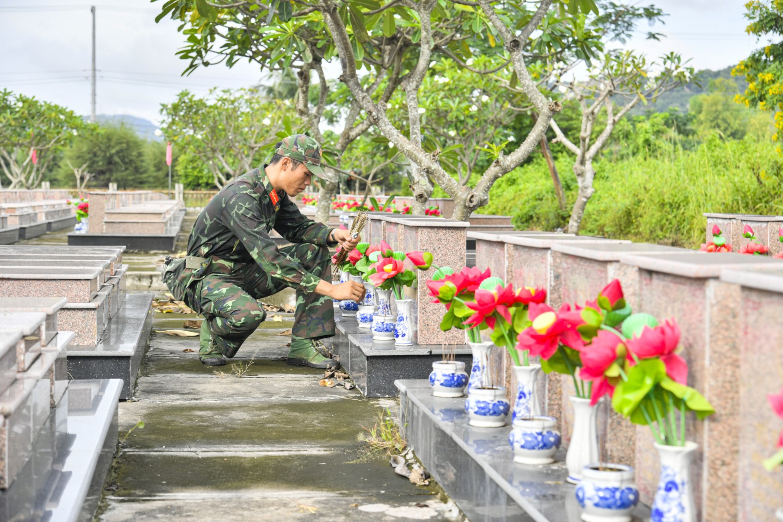 Chiến sĩ chỉnh trang các lọ hoa tại từng phần mộ liệt sĩ.