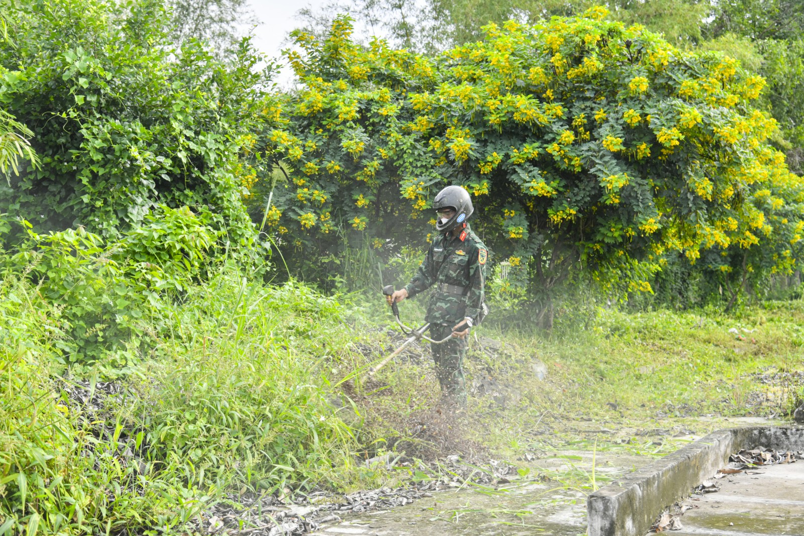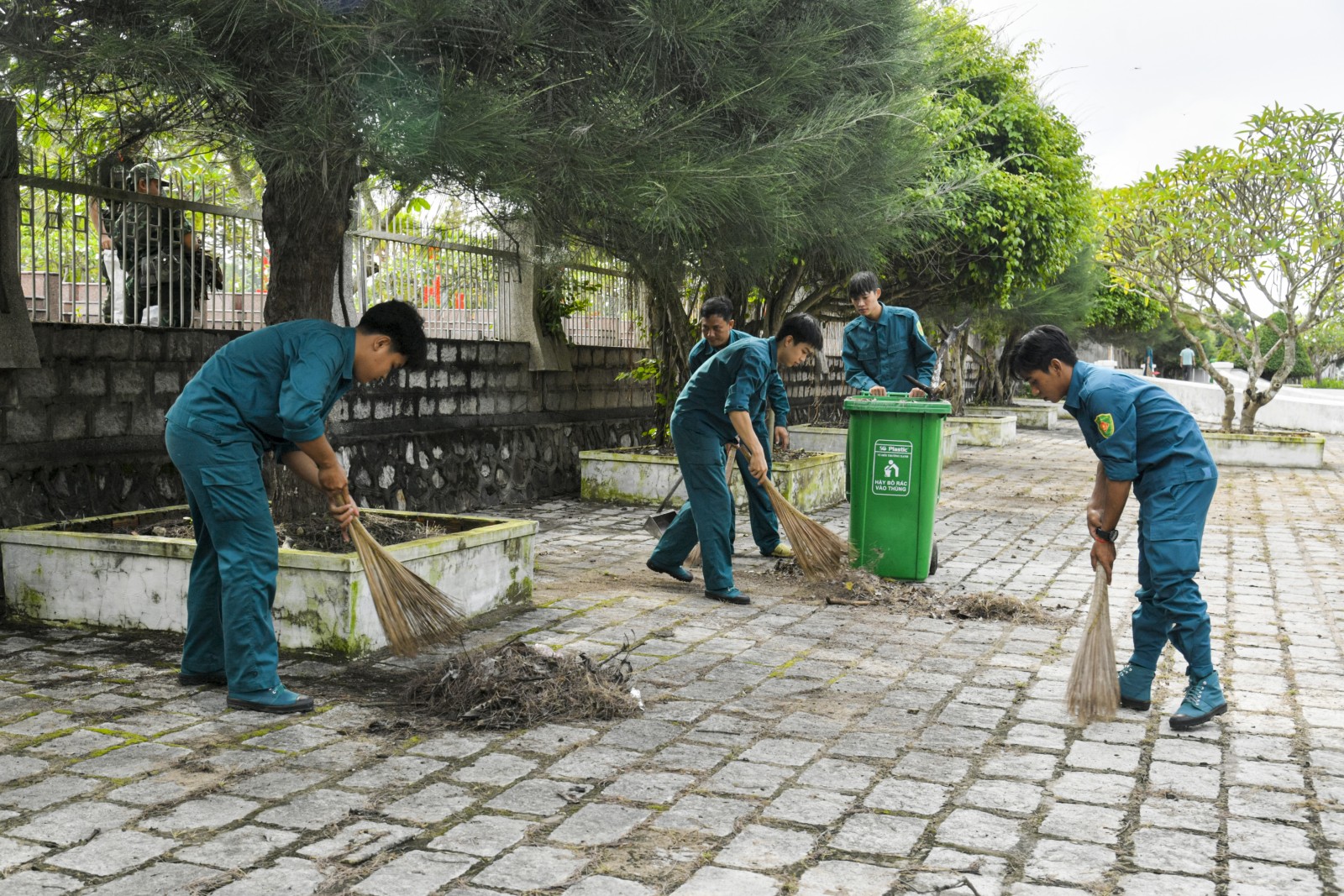 Chiến sĩ dân quân tự vệ quét dọn trong khuôn viên nghĩa trang.