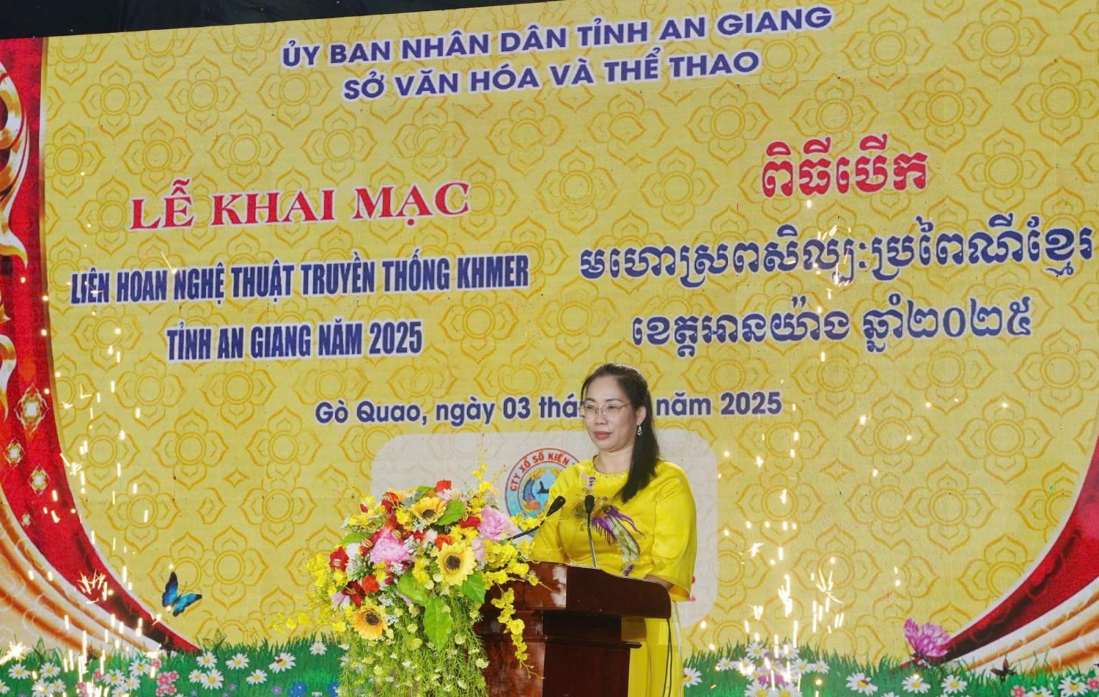 Phó Giám đốc Sở Văn hóa và Thể thao tỉnh An Giang Nguyễn Diệp Mai, Trưởng ban tổ chức Liên hoan, phát biểu khai mạc liên hoan.
