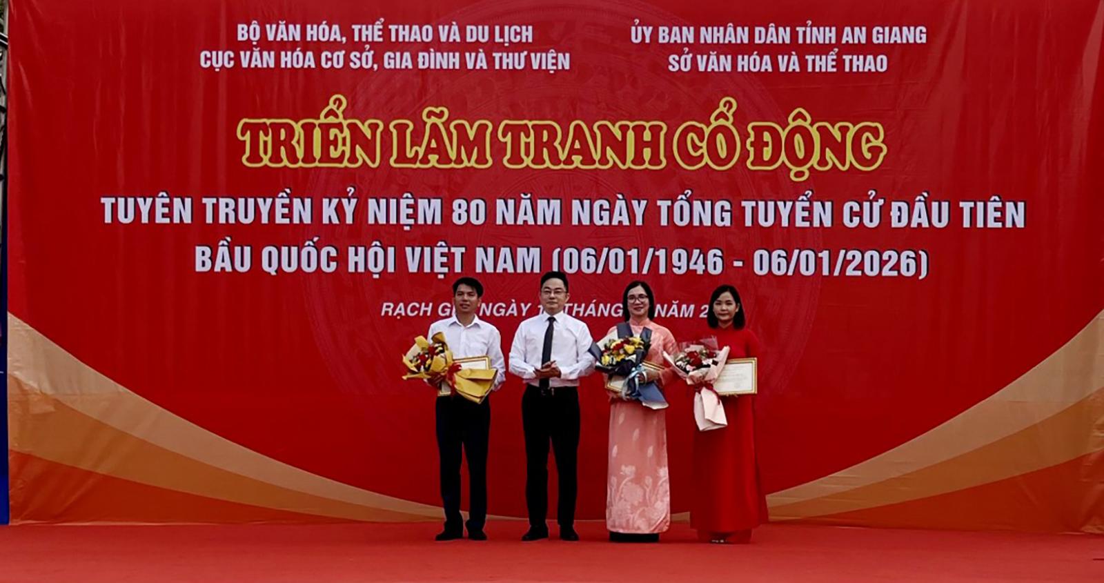 Phó Cục trưởng Cục Văn hóa cơ sở, Gia đình và Thư viện Nguyễn Quốc Huy tặng giấy khen cho tập thể Phòng Thông tin cổ động và Điện ảnh cùng các cá nhân có thành tích trong công tác phối hợp triển lãm.