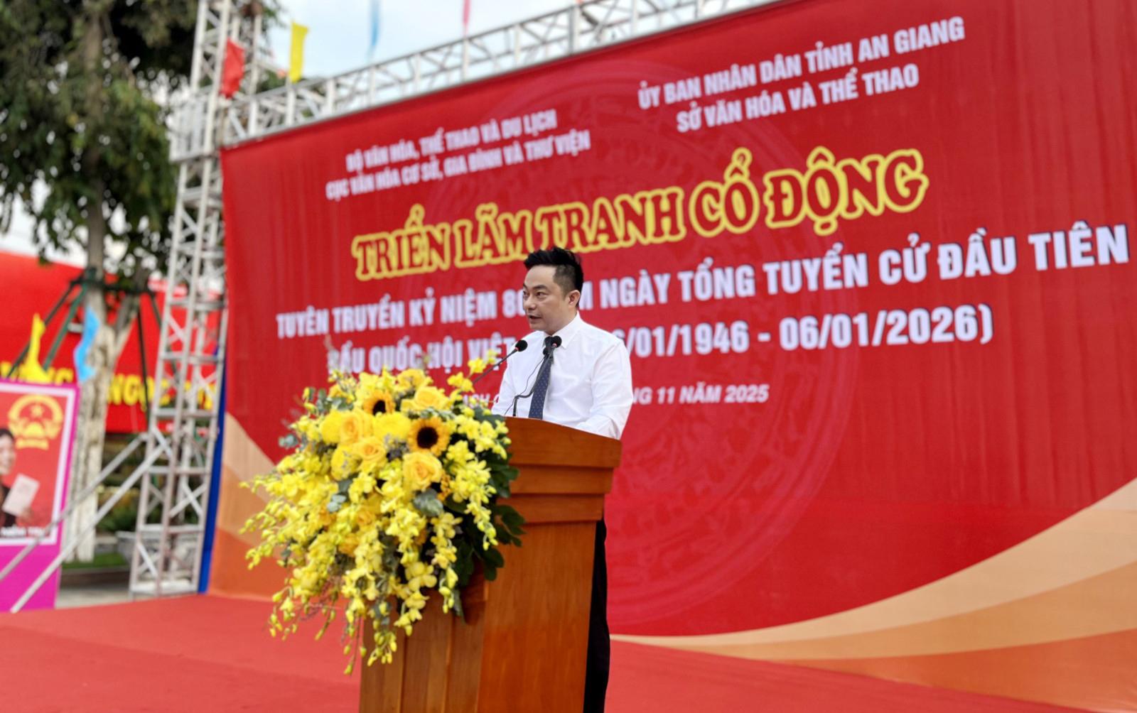 Phó Cục trưởng Cục Văn hóa cơ sở, Gia đình và Thư viện Nguyễn Quốc Huy phát biểu khai mạc triển lãm.