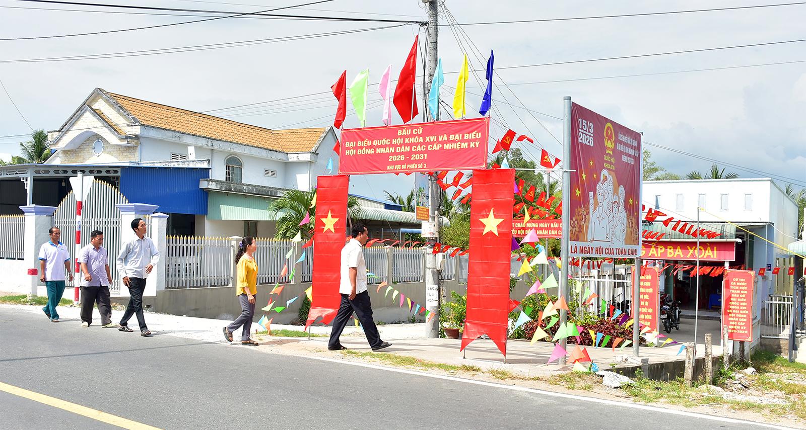 Tại xã Vĩnh Bình, trên nhiều tuyến đường, cờ Tổ quốc, pa nô và khẩu hiệu tuyên truyền được treo trang trọng, tạo không khí phấn khởi hướng đến ngày hội của toàn dân. Địa phương ứng dụng trí tuệ nhân tạo (AI) trong công tác tuyên truyền, “phủ xanh” thông tin tích cực trên mạng xã hội để cử tri trẻ tiếp cận nhanh chóng. Tại xã Vĩnh Phong, các khu vực bỏ phiếu được chỉnh trang sạch, đẹp, bố trí đầy đủ cơ sở vật chất và phương án bảo đảm an ninh, trật tự. Bí thư Đảng ủy xã Vĩnh Phong Nguyễn Chí Thanh nói: “Địa phương tăng cường tuyên truyền về mục đích, ý nghĩa của cuộc bầu cử và quyền, nghĩa vụ thiêng liêng của công dân trong việc tham gia xây dựng Nhà nước pháp quyền xã hội chủ nghĩa của Nhân dân, do Nhân dân và vì Nhân dân”.