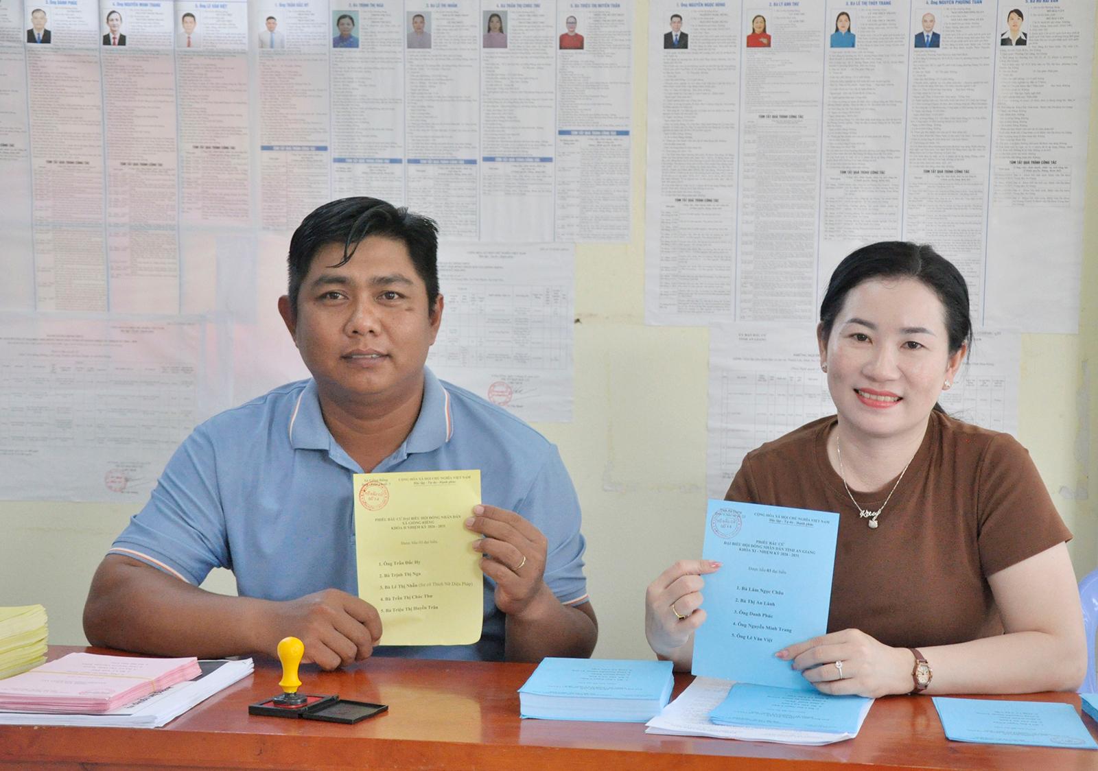 Thành viên tổ bầu cử tại xã Giồng Riềng chuẩn bị phiếu bầu. Ảnh: BÍCH THÙY