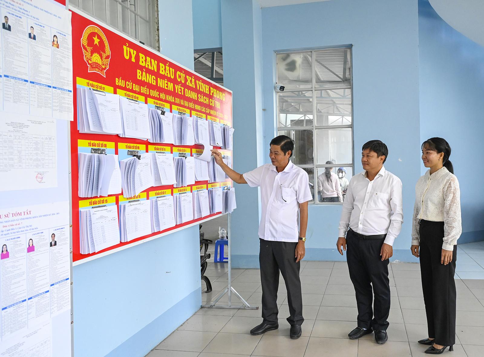 Lãnh đạo xã Vĩnh Phong kiểm tra niêm yết danh sách các ứng cử viên. Ảnh: THỦY TIÊN