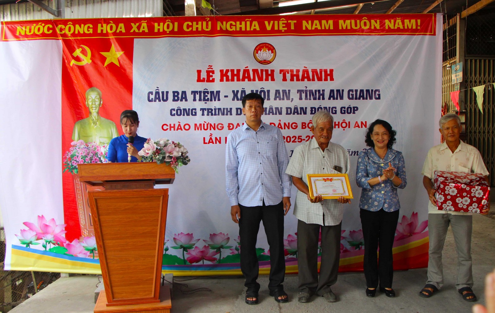 Tỉnh ủy viên, Bí thư Đảng ủy, Chủ tịch HĐND xã Hội An Nguyễn Thị Minh Kiều trao giấy khen tập thể có thành tích xuất sắc xây dựng cầu Ba Tiệm.