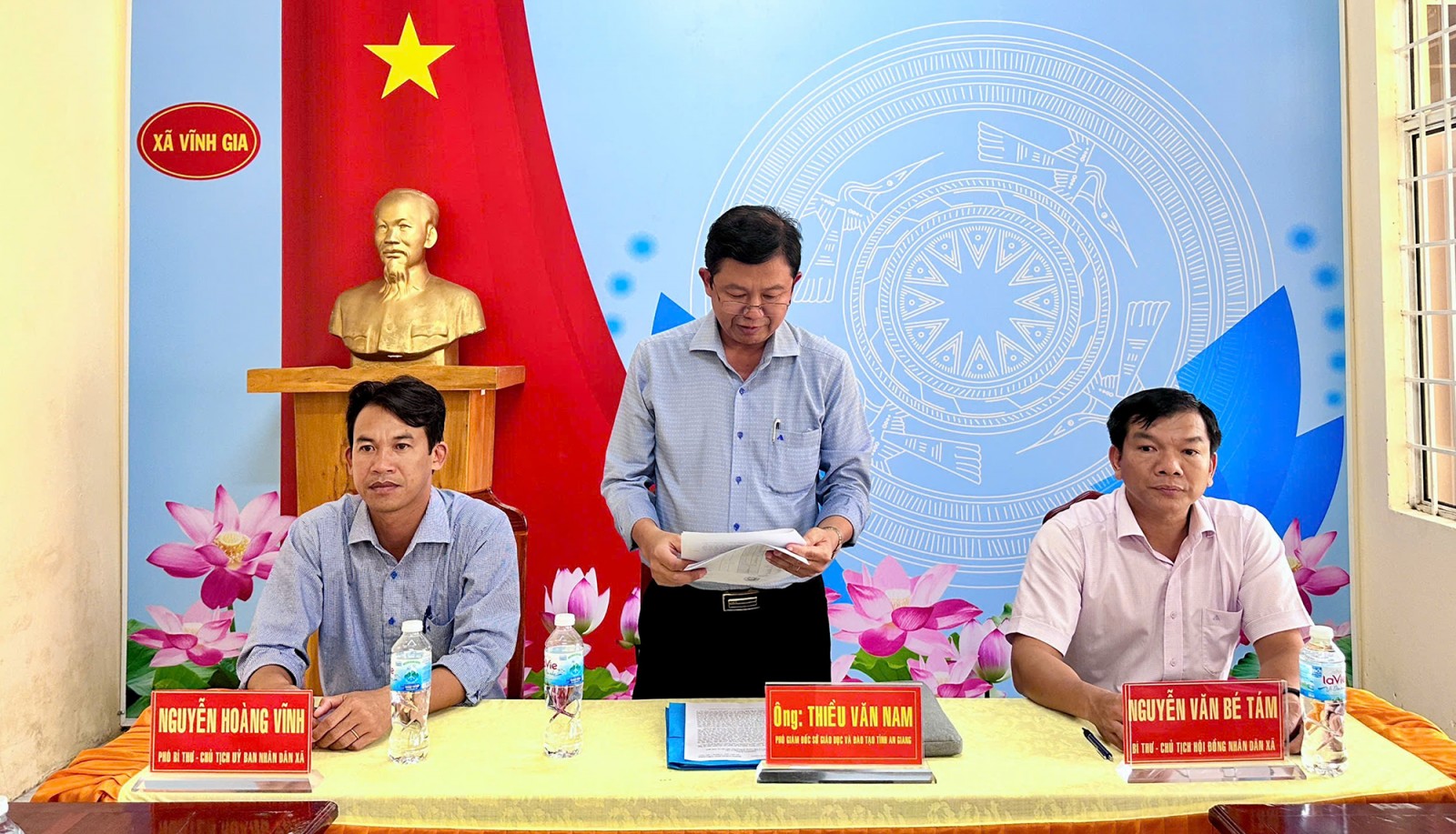 Chiều 9/9, Phó Giám đốc Sở Giáo dục và Đào tạo tỉnh An Giang Thiều Văn Nam dẫn đầu đoàn công tác đã đến làm việc với xã Vĩnh Gia về phương án đầu tư, xây dựng trường phổ thông nội trú, bán trú liên cấp Tiểu học - Trung học cơ sở tại các xã biên giới đất liền.