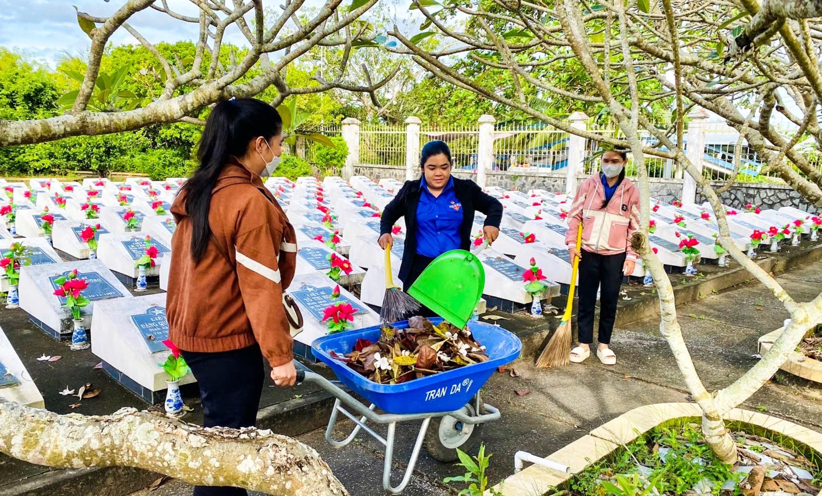 Đoàn viên, thanh niên xã dọn vệ sinh tại Nghĩa trang liệt sĩ Cây Bàng. Ảnh: THỦY TIÊN