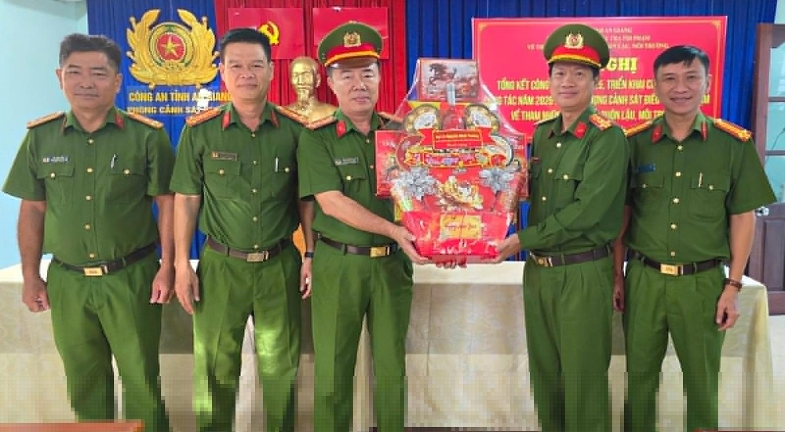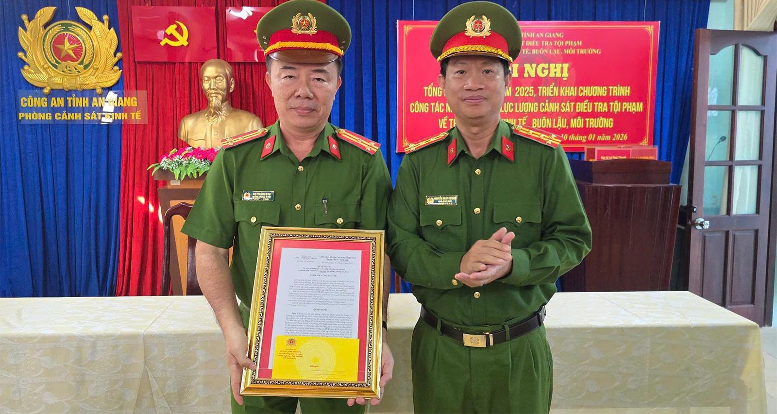 Đại tá Nguyễn Nhật Trường, Phó Giám đốc Công an tỉnh An Giang, trao quyết định khen thưởng đột xuất cho Phòng Cảnh sát kinh tế.