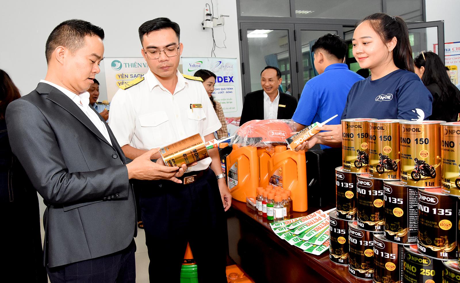 Ông Phan Thảo (bìa trái), Chủ tịch Hội đồng quản trị kiêm Tổng Giám đốc Công ty Cổ phần NPOIL Việt Nam trao đổi về cách nhận biết hàng chính hãng tại Chi cục Quản lý thị trường tỉnh An Giang.