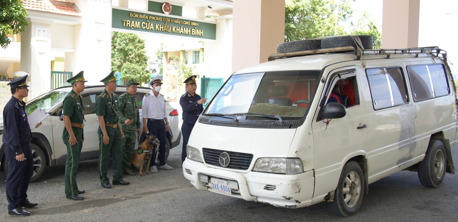 Lực lượng chiến sĩ Đồn Biên phòng Cửa khẩu Long Bình và hải quan kiểm tra các phương tiện chở hàng hóa qua cửa khẩu. Ảnh: DANH THÀNH