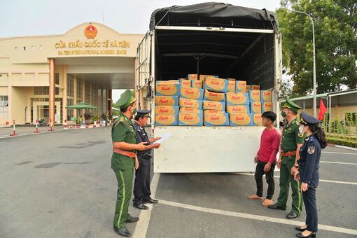 Lực lượng Đồn Biên phòng Cửa khẩu quốc tế Hà Tiên cùng hải quan kiểm tra hàng hóa trước khi xuất khẩu qua Campuchia. Ảnh: DANH THÀNH