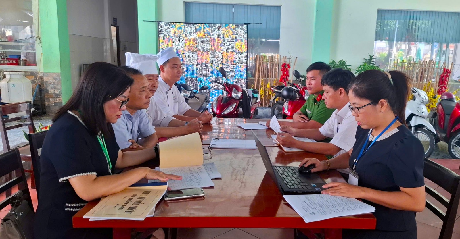Đoàn kiểm tra liên ngành của tỉnh An Giang kiểm tra hồ sơ pháp lý, nguồn gốc, xuất xứ và hóa đơn, chứng từ của các loại nguyên liệu thực phẩm đầu vào.