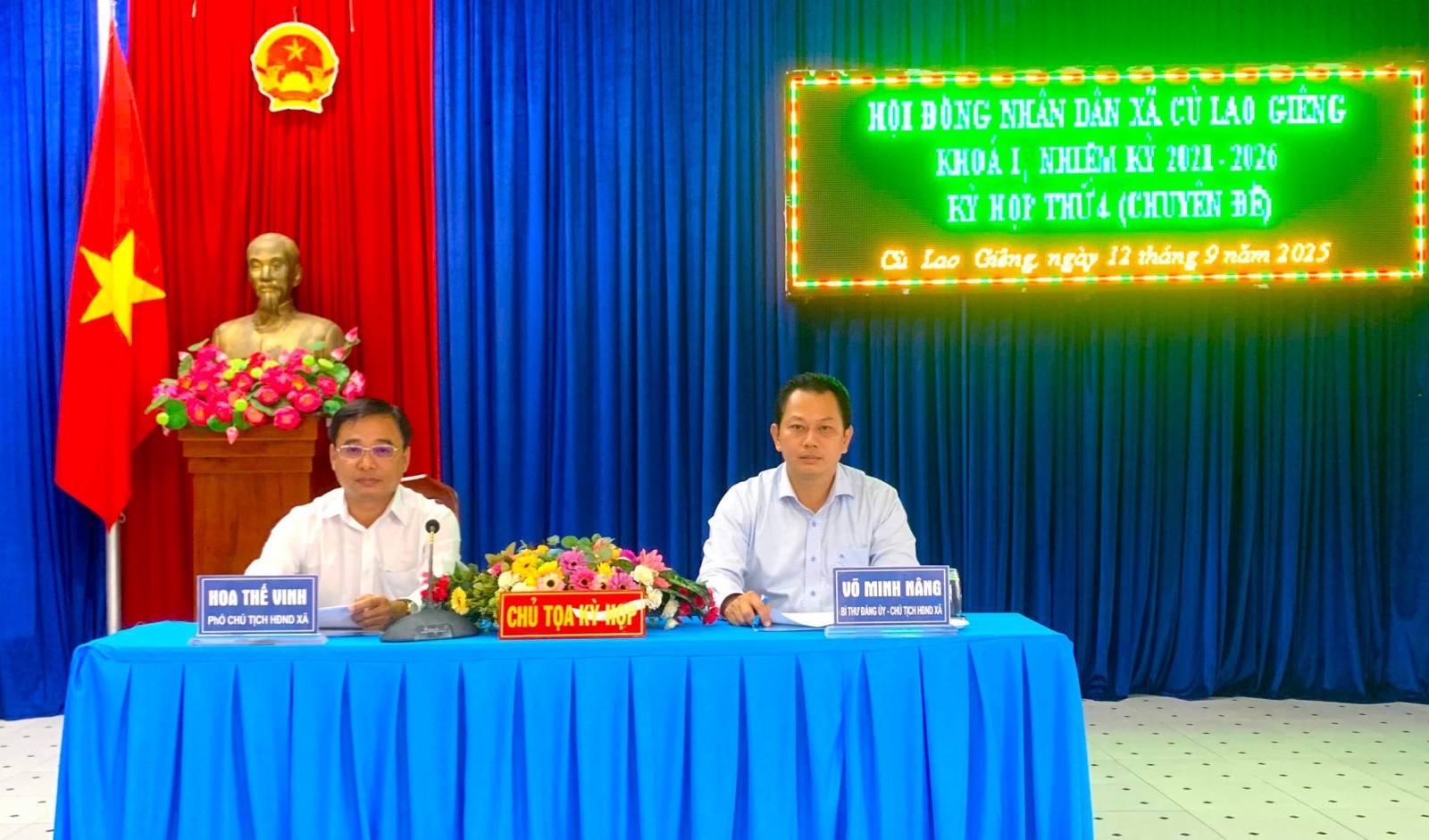 Sáng 12/9, HĐND xã Cù Lao Giêng (tỉnh An Giang) tổ chức kỳ họp thứ 4 (chuyên đề) khóa I, nhiệm kỳ 2025 - 2030. Bí thư Đảng ủy, Chủ tịch HĐND xã Cù Lao Giêng Võ Minh Nâng chủ toạ kỳ họp.