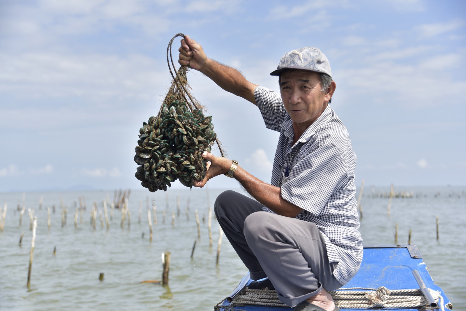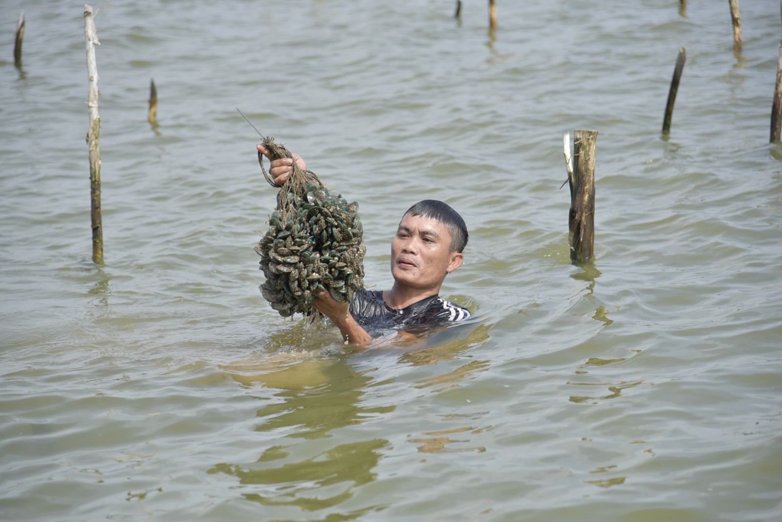 Người dân thu hoạch vẹm xanh. Ảnh ĐẶNG LINH