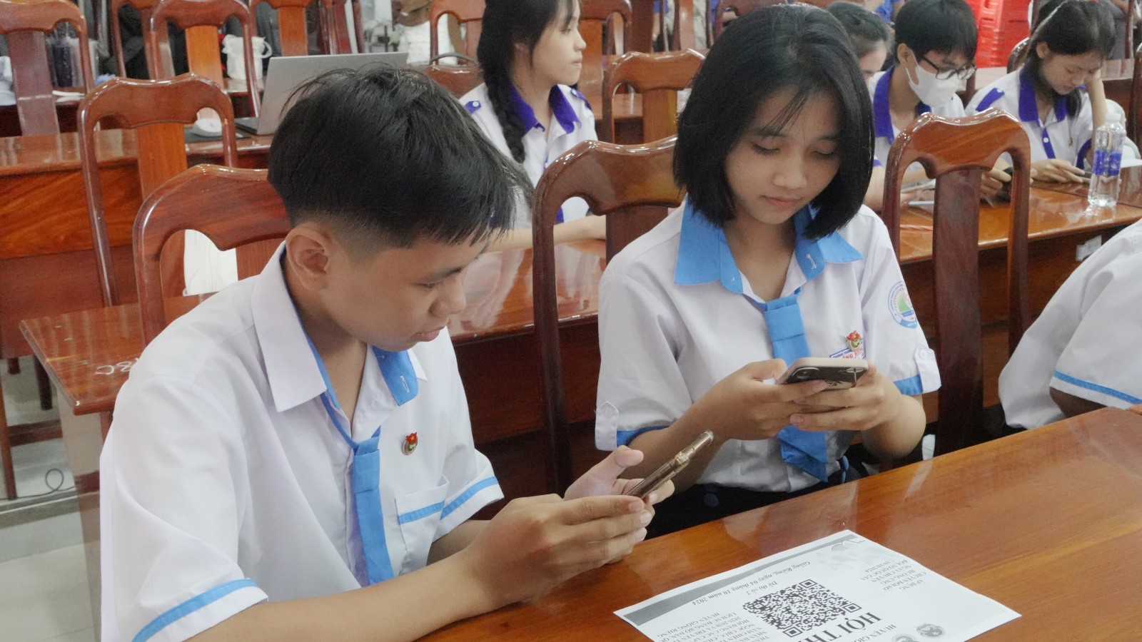 Học sinh tham gia tìm hiểu tiểu sử Anh hùng Lực lượng vũ trang nhân dân Mai Thị Nương qua hình thức quét mã QR.