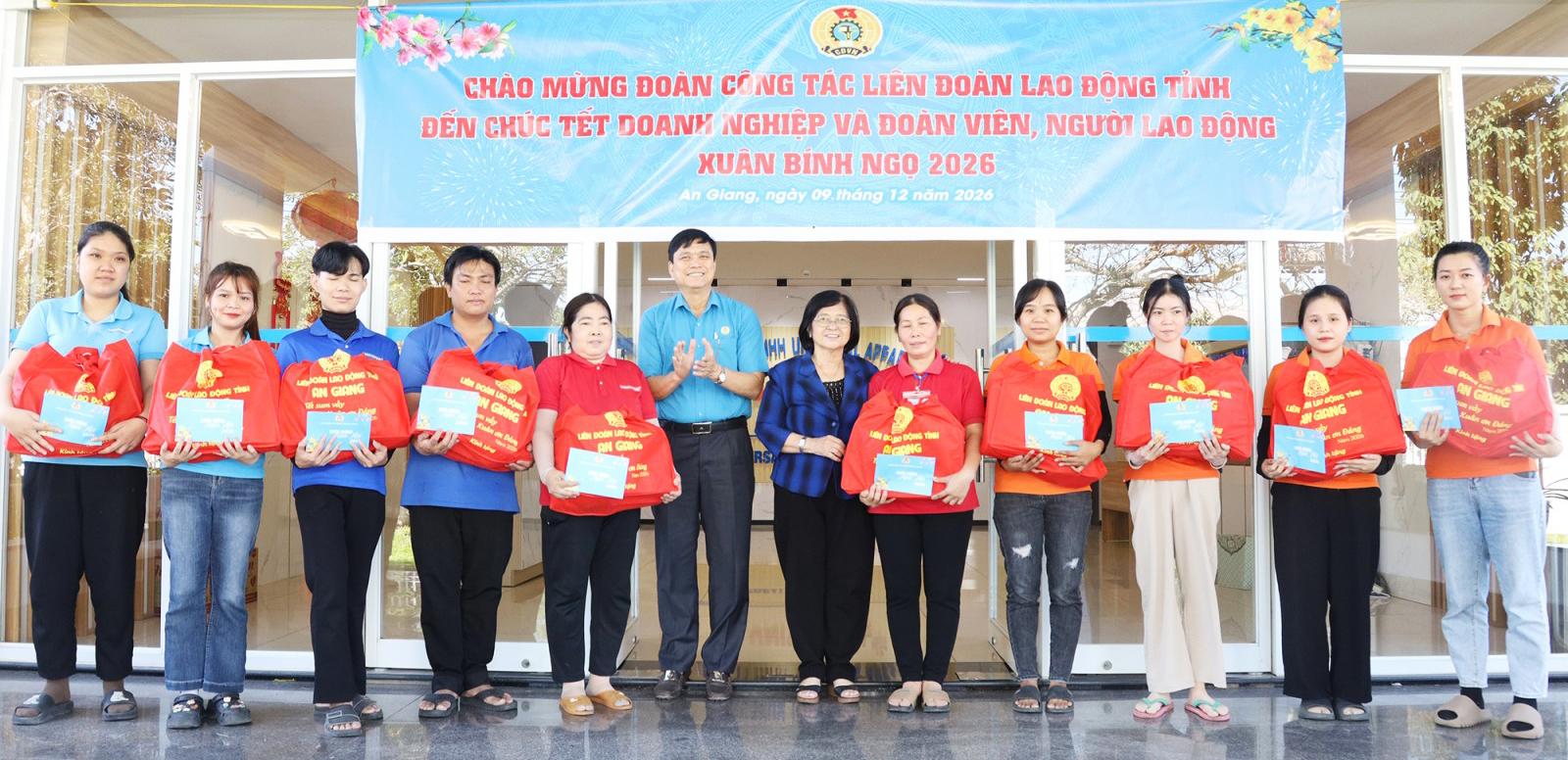 Đoàn đến thăm, chúc tết doanh nghiệp và tặng quà cho đoàn viên, người lao động của Công ty TNHH NV Apparel, Công ty TNHH An Giang Samho, Công ty TNHH Universal Apparel, Công ty TNHH Công nghệ may mặc Spectre An Giang Việt Nam (đóng tại Khu công nghiệp Bình Hòa, xã Bình Hòa); Công ty Cổ phần TBS An Giang, xã Phú Hòa.