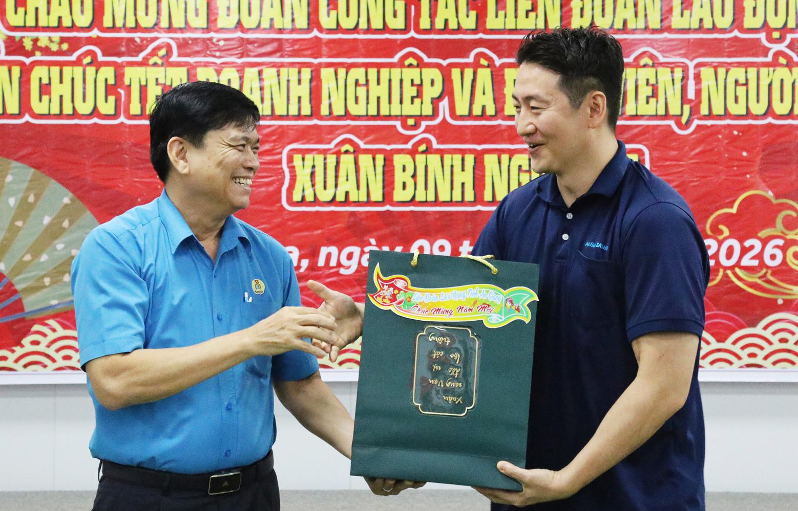 Chủ tịch Liên đoàn Lao động tỉnh An Giang Đỗ Trần Thịnh tặng quà Công ty TNHH An Giang Samho.