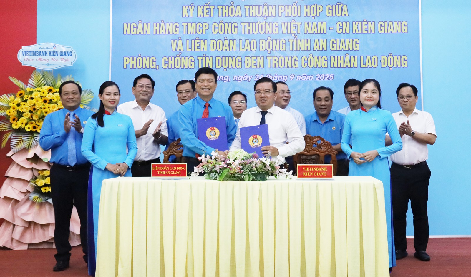 Chiều 24/9, Liên đoàn Lao động tỉnh An Giang tổ chức hội nghị ký kết thỏa thuận phối hợp giữa Ngân hàng Thương mại Cổ phần Công thương Việt Nam chi nhánh Kiên Giang (VietinBank chi nhánh Kiên Giang) và Liên đoàn Lao động tỉnh An Giang triển khai thực hiện đề án “Tổ chức Công đoàn phòng, chống tín dụng đen trong công nhân, lao động”.