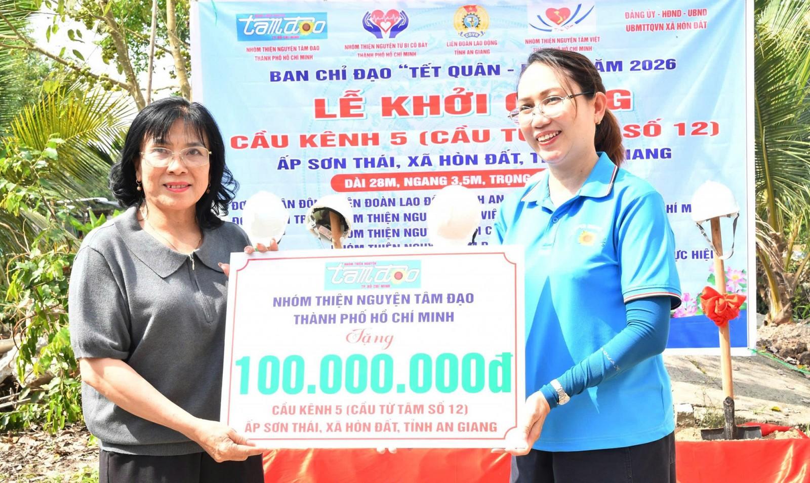 Đại diện Nhóm thiện nguyện Tâm Đạo TP. Hồ Chí Minh (bên phải) tài trợ kinh phí xây cầu Kênh 5, ấp Sơn Thái.