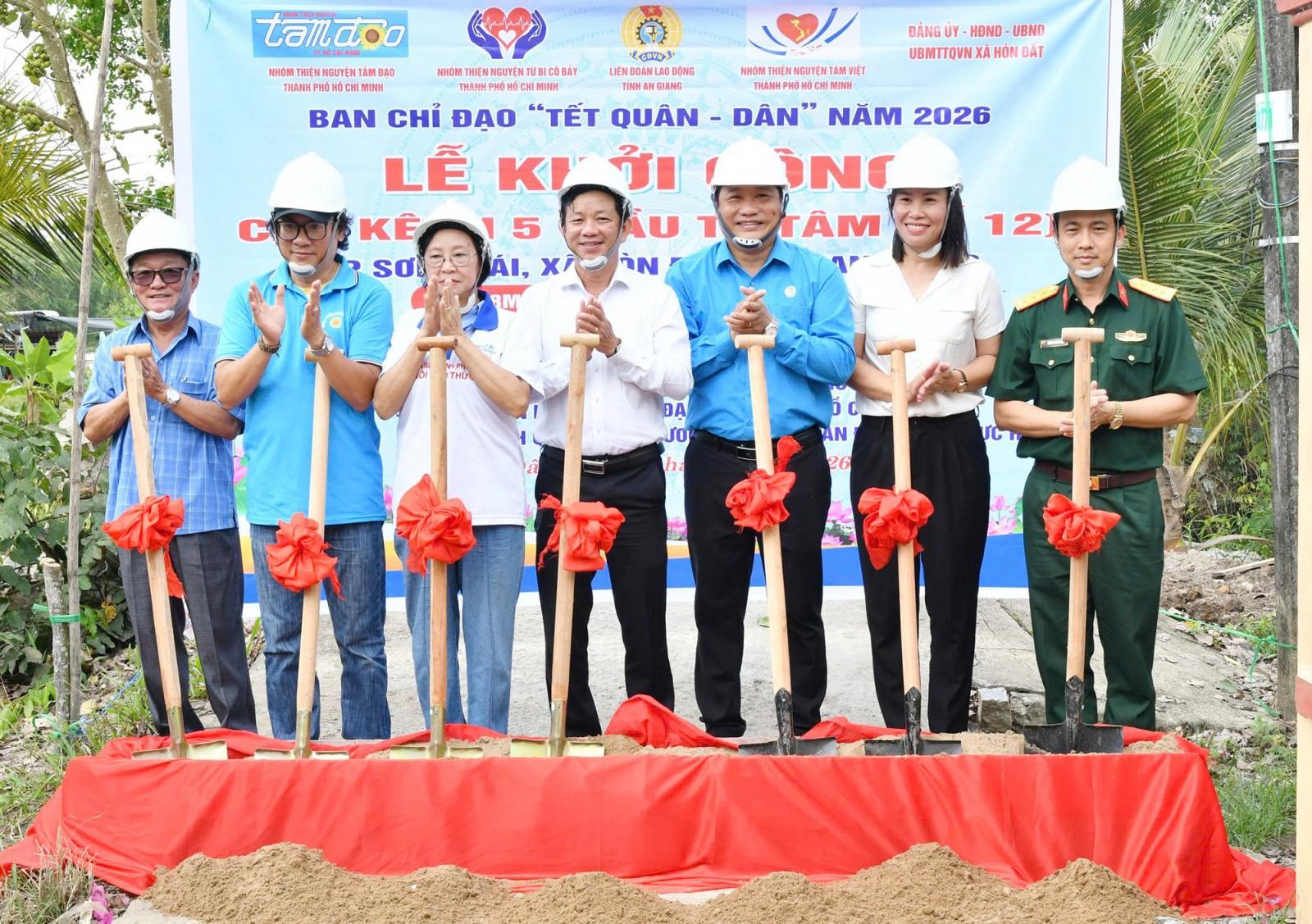 Đại biểu thực hiện nghi thức động thổ khởi công xây dựng cầu Kênh 5, ấp Sơn Thái.