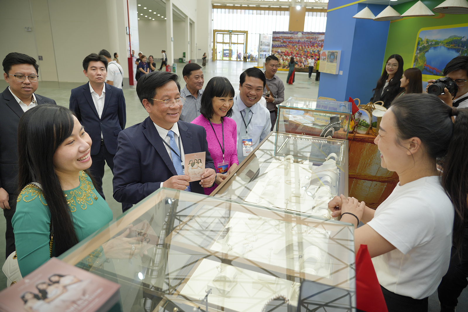 Chủ tịch UBND tỉnh An Giang Hồ Văn Mừng tham quan gian hàng sản phẩm ngọc trai của tỉnh An Giang.