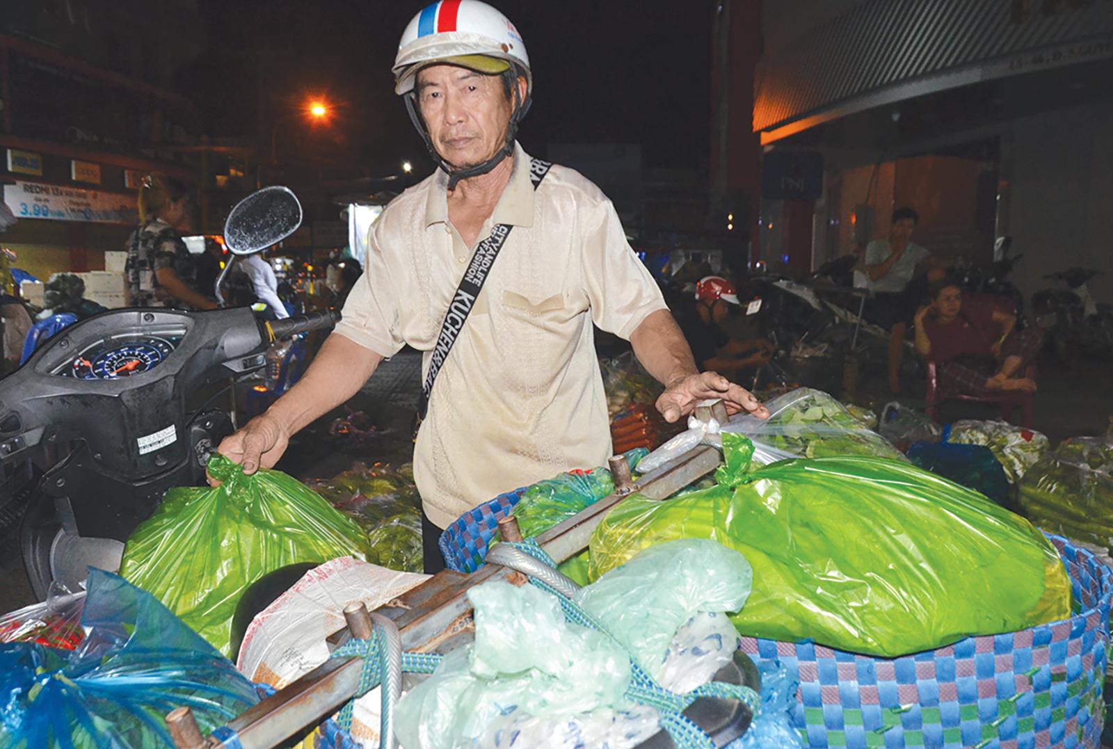 Mỗi đêm, ông Sáu Cựa có mặt ở chợ từ 23 giờ, lấy rau từ các thương lái rồi chở về chợ Tắc Ráng bán. Ảnh: HƯƠNG GIANG