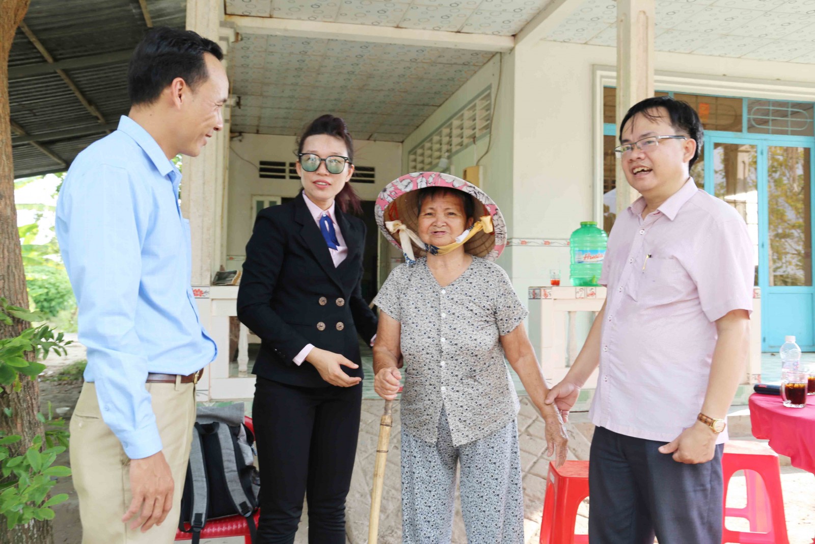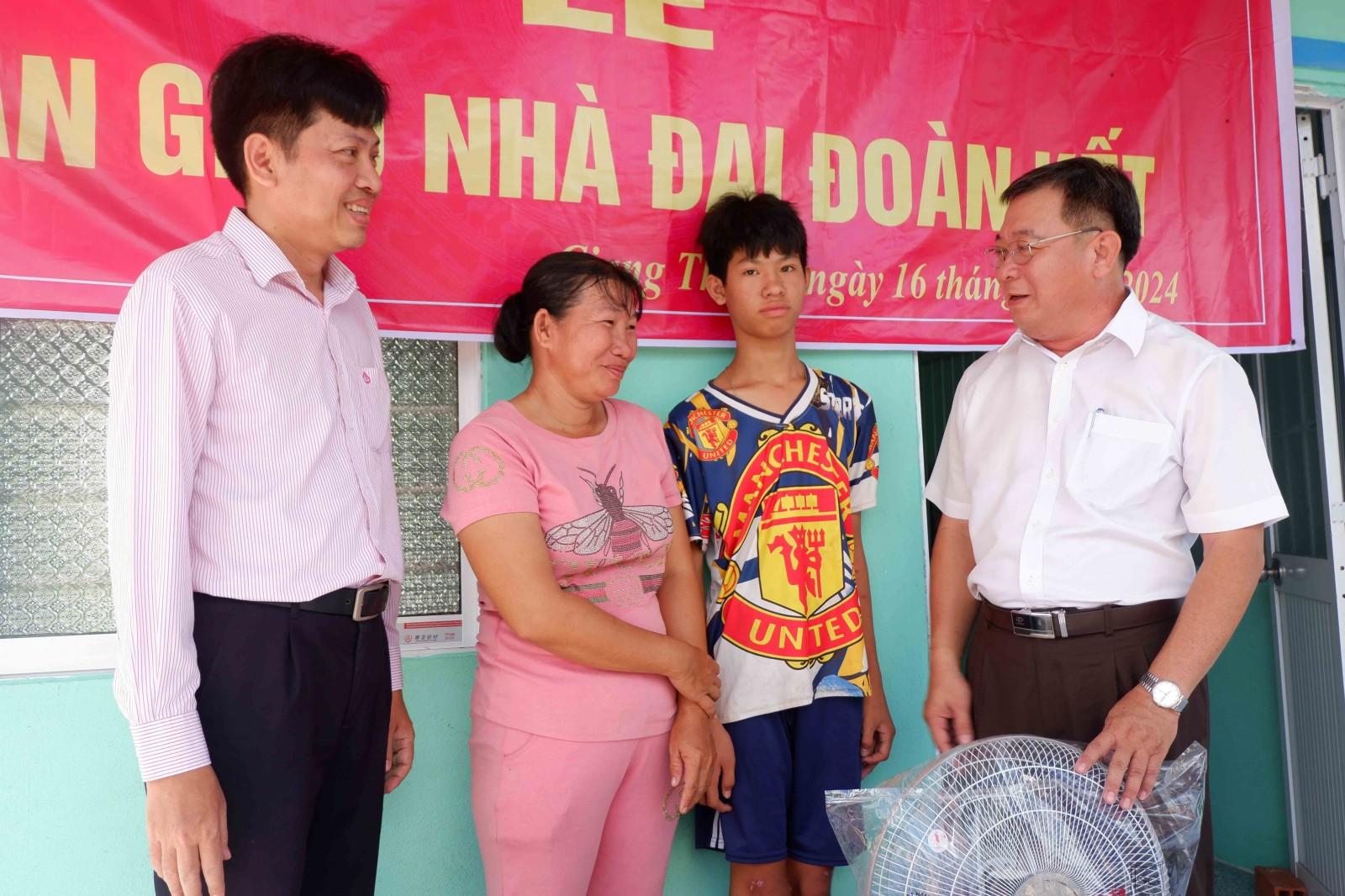 Ủy viên Ban Thường vụ Tỉnh ủy, Phó Chủ tịch Thường trực Ủy ban MTTQ Việt Nam tỉnh An Giang Lê Thanh Việt (bìa phải) bàn giao nhà Đại đoàn kết và thăm hỏi tình hình đời sống của người dân xã Giang Thành.