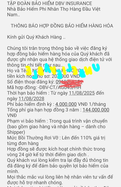 Ngay sau khi chuyển khoản, chị P.N nhận được tin nhắn lạ xưng là “Tập đoàn Bảo hiểm DBV Insurance” với nội dung hết sức chi tiết và chuyên nghiệp: “Kính gửi quý khách hàng. Chúng tôi trân trọng thông báo về việc đăng ký hợp đồng bảo hiểm hàng hóa của quý khách đã được ghi nhận. Mã hợp đồng DBV-CT/AG045/HH, thời hạn bảo hiểm: Từ ngày 11/8/2025 đến ngày 11/8/2028. Phí bảo hiểm định kỳ: 4 triệu đồng/tháng; tổng phí gia hạn hợp đồng 3 năm là 144 triệu đồng. Trong quá trình vận chuyển (bao gồm giao hàng và nhận hàng - dành cho shipper), mức bồi thường rơi vỡ lên đến 110% giá trị từng đơn hàng. Hợp đồng sẽ được kích hoạt chính thức trong vòng 24 giờ kể từ thời điểm giao dịch. Quý khách vui lòng kiểm tra lại đầy đủ thông tin đã đăng ký để đảm bảo quyền lợi bảo hiểm của mình. Mọi thắc mắc vui lòng liên hệ nhân viên tư vấn để được hỗ trợ nhanh chóng”.