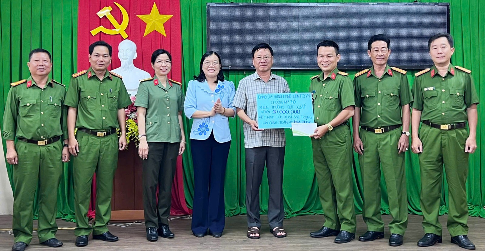 Lãnh đạo Ủy ban nhân dân phường Mỹ Thới khen thưởng đột xuất lực lượng Công an phường trong đấu tranh với tội phạm ma túy. Ảnh: NGUYỄN HƯNG