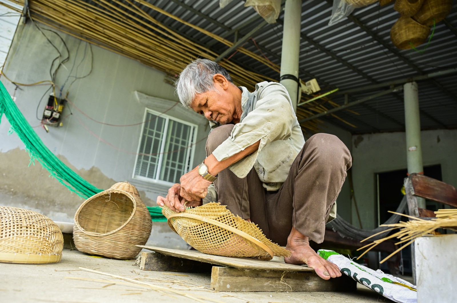 Ông Ba Lùn chuẩn bị hoàn thành sản phẩm đan đát. Ảnh: THỦY TIÊN
