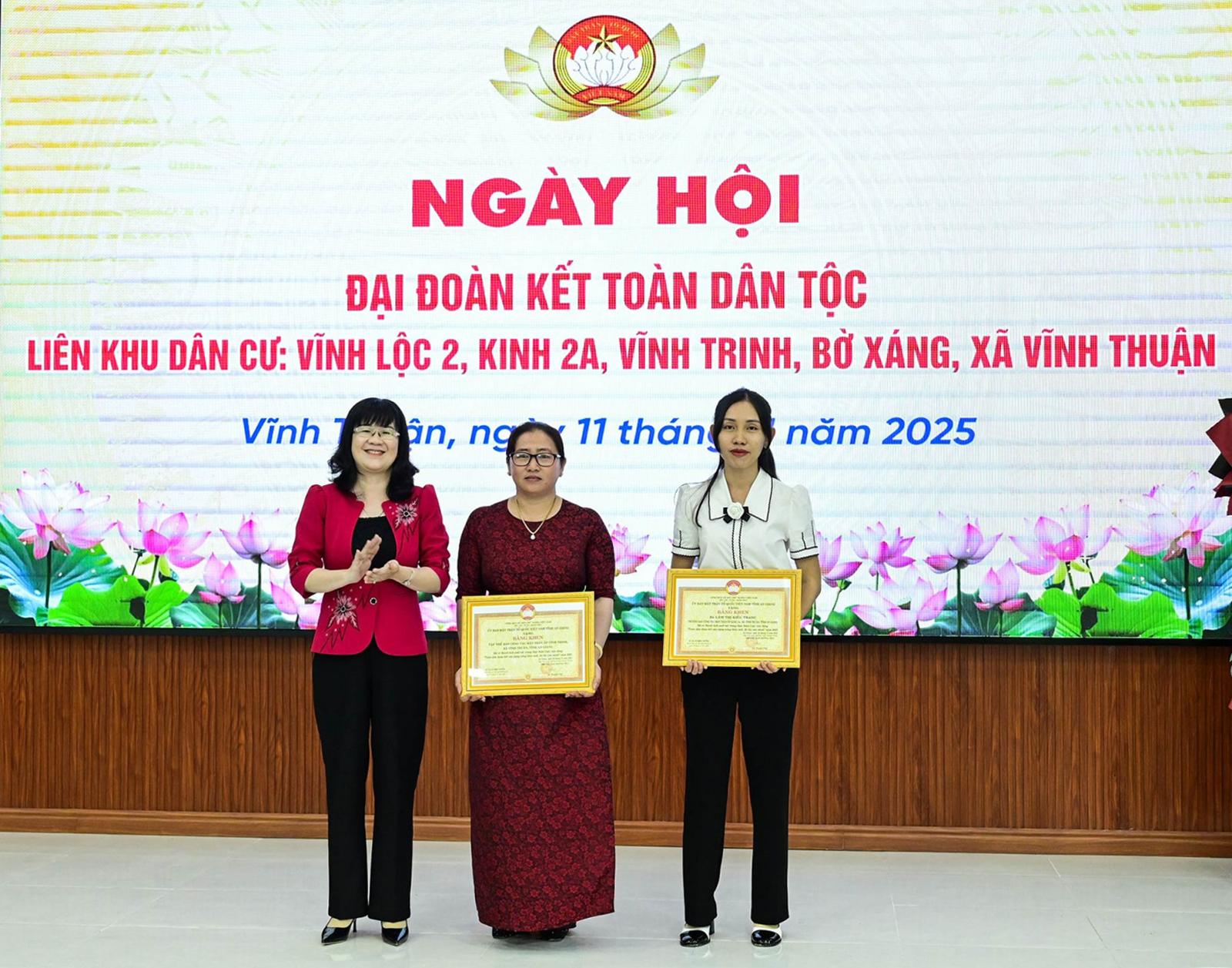Dịp này, Ủy ban MTTQ Việt Nam tỉnh An Giang tặng bằng khen cho 1 tập thể, 1 cá nhân có thành tích xuất sắc trong thực hiện cuộc vận động “Toàn dân đoàn kết xây dựng nông thôn mới”; UBND Vĩnh Thuận trao giấy biểu dương cho 15 cá nhân có thành tích xuất sắc trong phong trào thi đua yêu nước năm 2025. Nhân ngày hội, Ủy ban MTTQ Việt Nam tỉnh, Ủy ban MTTQ Việt Nam xã Vĩnh Thuận tặng 18 suất quà cho hộ nghèo, cận nghèo trên địa bàn xã.