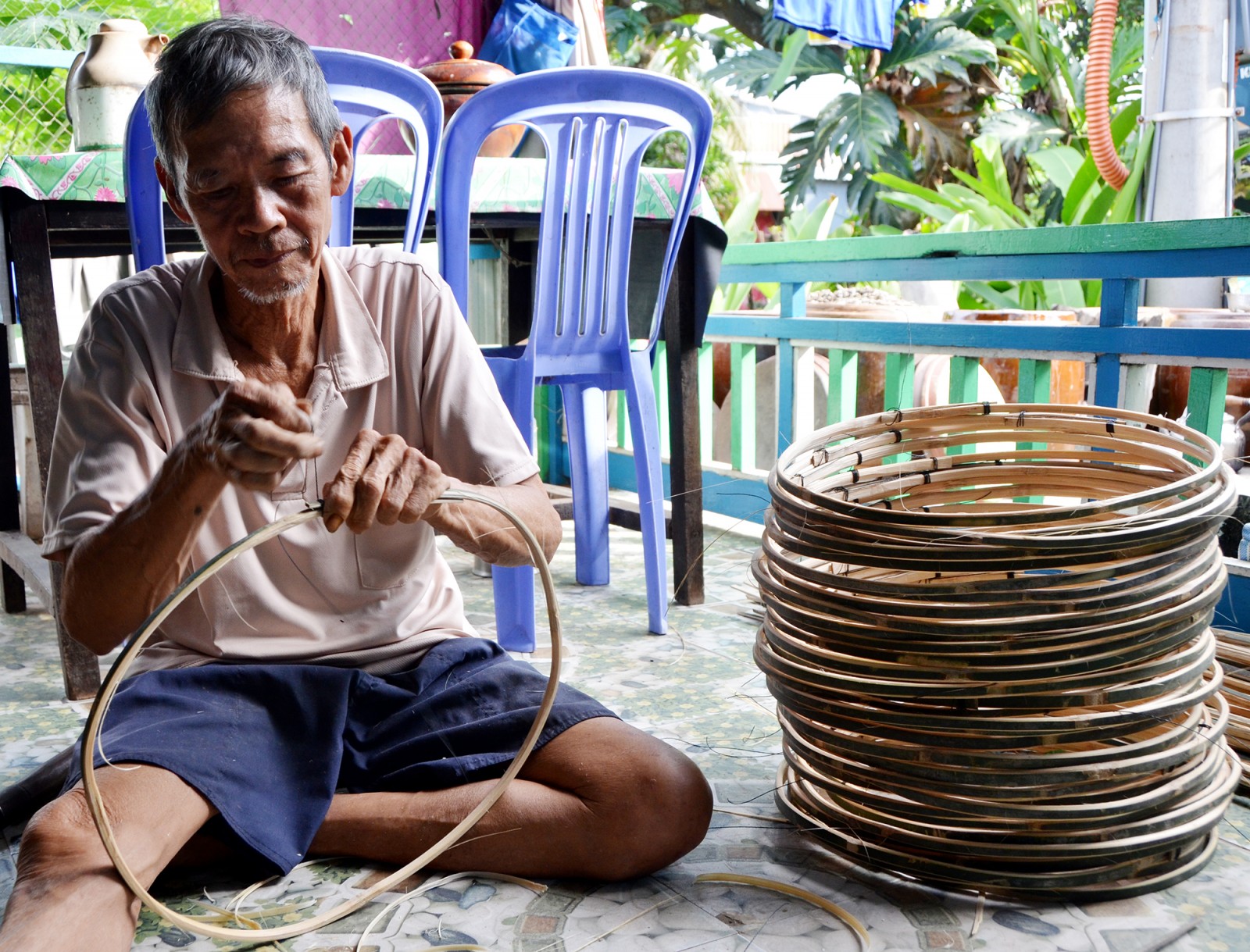 Ông Ngô Văn Út đang làm vành lọp tôm. Ảnh: TRỌNG TÍN